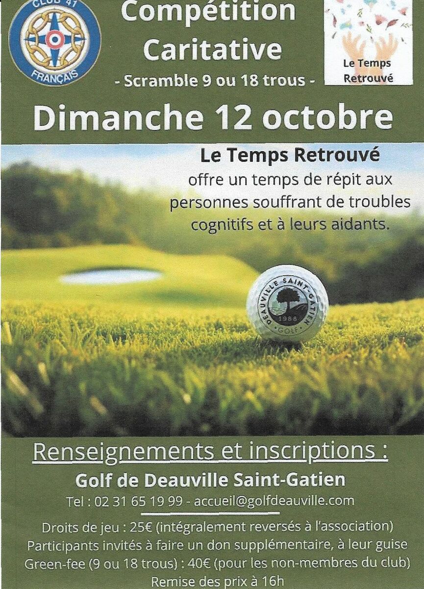 Les associations Le Temps Retrouvé et Le Club 41 français organisent une compétition caritative au Golf de Saint Gatien le 12 octobre 2025. Pour toute précision, consultez le document associé.